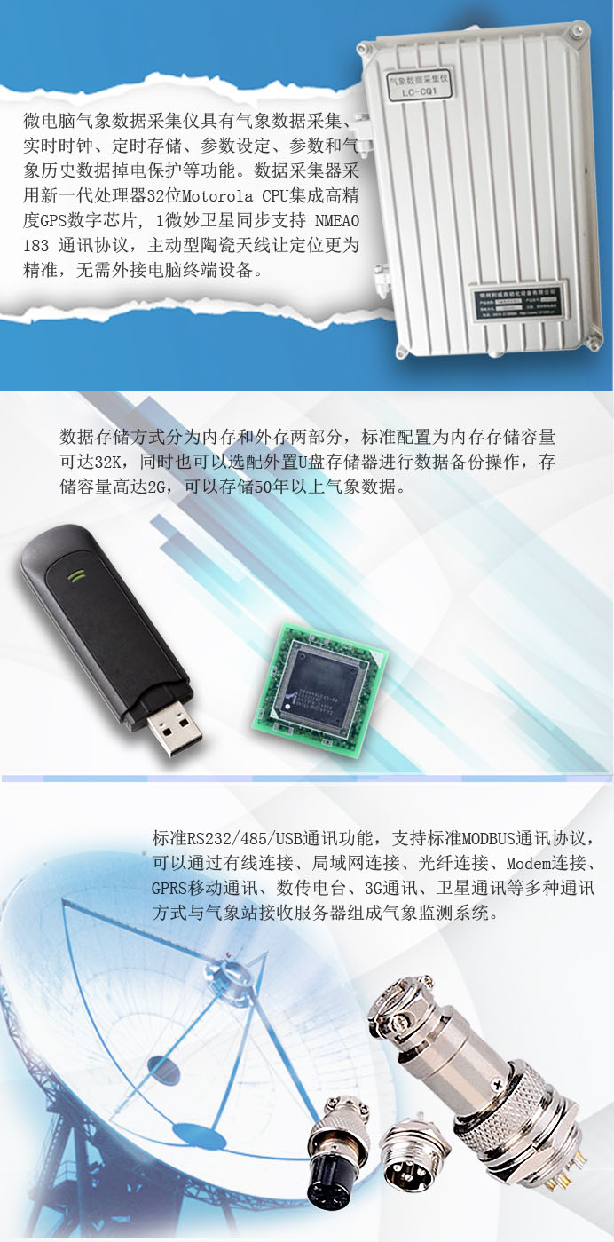 2、微電腦氣象數(shù)據(jù)采集儀具有氣象數(shù)據(jù)采集、實時時鐘、定時存儲、參數(shù)設(shè)定、參數(shù)和氣象歷史數(shù)據(jù)掉電保護(hù)等功能。數(shù)據(jù)采集器采用新一代處理器32位Motorola CPU集成高精度GPS數(shù)字芯片, 1微妙衛(wèi)星同步支持 NMEA0183 通訊協(xié)議,主動型陶瓷天線讓定位更為精準(zhǔn),通過氣象監(jiān)測軟件可以準(zhǔn)確定位查看監(jiān)測區(qū)域的氣象環(huán)境數(shù)據(jù),方便于移動觀測氣象數(shù)據(jù),工業(yè)控制標(biāo)準(zhǔn)化設(shè)計,便攜式防振結(jié)構(gòu),漢字液晶鍵盤人機(jī)界面,使用先進(jìn)的雙屏顯示技術(shù),主屏顯示實時氣象數(shù)據(jù)信息,輔屏顯示地理狀況信息包括方位、高度、天氣預(yù)報資料等等,人機(jī)界面友好,便于現(xiàn)場實時查看氣象分析數(shù)據(jù),無需外接電腦終端設(shè)備。
