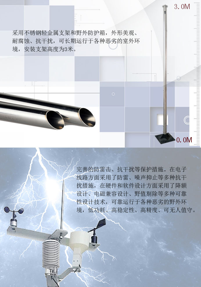 7、采用不銹鋼輕金屬支架和野外防護(hù)箱,外形美觀、耐腐蝕、抗干擾,可長期運行于各種惡劣的室外環(huán)境,安裝支架高度為3米。